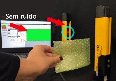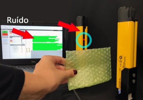 Enquanto a cortina parece estar alinhada, o software indica que na verdade existe ruído de alinhamento. Nesse caso a máquina que não deveria detectar sujeiras e rejeitos, detecta e aciona a parada de máquina.