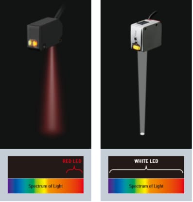 Ao contrário dos sensores convencionais, que utilizam apenas um LED vermelho, a LR-W usa um LED branco e todo o espectro de cores. Ao fazer isso, a LR-W pode diferenciar de forma confiável e estável uma variedade muito maior de alvos.