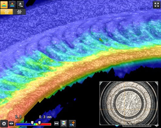 Ao criar uma imagem 3D, as posições de cada perfil 2D são ajustadas nas direções X, Z e θ. Isso elimina o impacto da vibração e excentricidade, bem como de dobras e curvaturas no alvo, criando uma imagem ideal para inspeção.