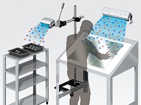 Os ventiladores de eliminação de estática da série SJ-F2000/5000 são ionizadores de sensoriamento amplo que neutralizam problemas induzidos por estática do ambiente, incluindo produtos, corpos humanos e peças periféricas. Diversas configurações para um ambiente livre de estática são possíveis devido ao alto desempenho de eliminação de estática (mais rápido da categoria), ao equilíbrio de íons de alta precisão e também à função de ajuste de fluxo de ar de intervalo amplo.Uma vez que os íons são fornecidos em um equilíbrio ideal que corresponde à carga eletrostática, não são necessárias configurações iniciais trabalhosas durante a implementação ou manutenção, o que facilita o seu uso e uma eliminação de estática ainda mais eficiente. Por fim, com funções que suprimem o desgaste e acúmulo de sujeira na sonda de eliminação, o sistema de controle de estática emprega uma estrutura que permite manutenção fácil e um corpo compacto que ocupa pouco espaço para a instalação.