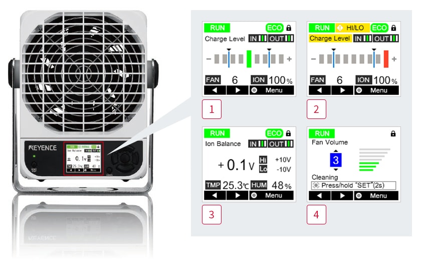 A unidade principal está equipada com uma tela LCD que pode ser usada para verificar o status de funcionamento, os dados de eletricidade estática e outras informações.