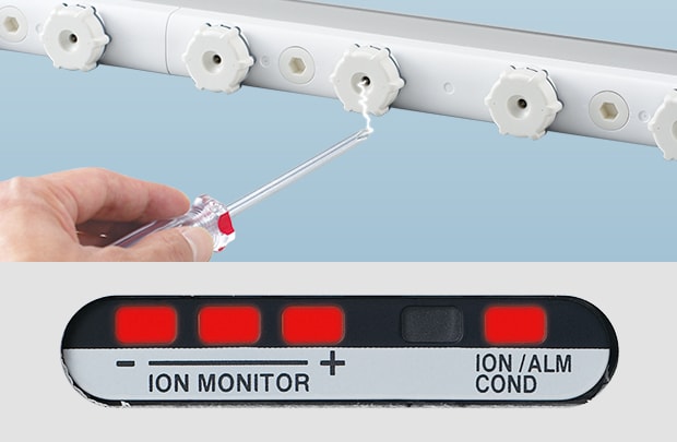 A Série SJ-H inclui uma função de autodiagnóstico que monitora o nível de geração de íons. Com o LED de barra e as saídas de alarme, o ionizador alerta sobre a necessidade de manutenção.
