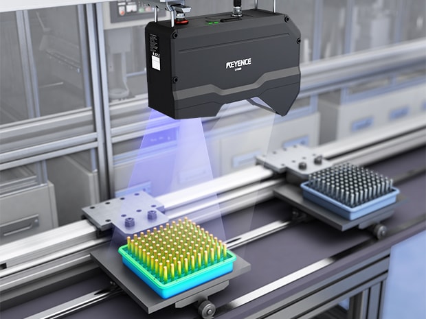 A Série LJ-S8000 pode ser usada para identificar os tipos de injetores dispostos no palete. Com um amplo campo de visão de até 640 × 640 mm, é possível detectar com facilidade tipos de produtos mistos simplesmente instalando o sistema.