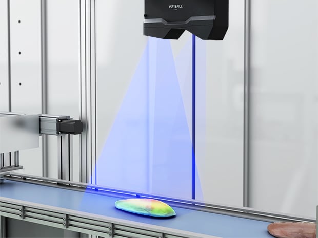 Para evitar o cozimento insuficiente causado por variações nas dimensões ou no volume da carne fresca, a inspeção 3D é cada vez mais adotada em fábricas de alimentos. Usando dados de altura, é possível medir não apenas comprimento e largura, mas também espessura.