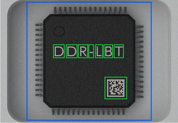 Leia os caracteres/códigos 2D marcados a laser na superfície de chips de CI. Uma única câmera pode reconhecer simultaneamente caracteres, como números de peças, e códigos 2D.