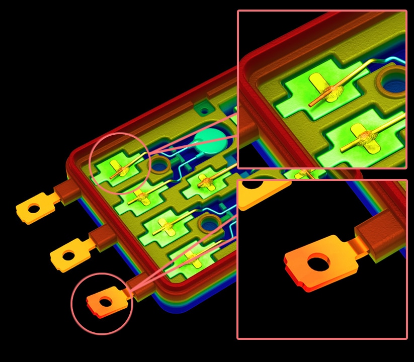 Com uma imagem 2D convencional, o desalinhamento da soldagem e terminais dobrados podem facilmente passar despercebidos porque sozinhos os valores da escala de cinza não são suficientes para uma inspeção confiável. A imagem 3D dá estabilidade a estas inspeções com dados de altura, então é possível inspecionar o desalinhamento, a desmontagem da fiação e defeitos de soldagem sem ter que se preocupar com a variação de cor da peça.