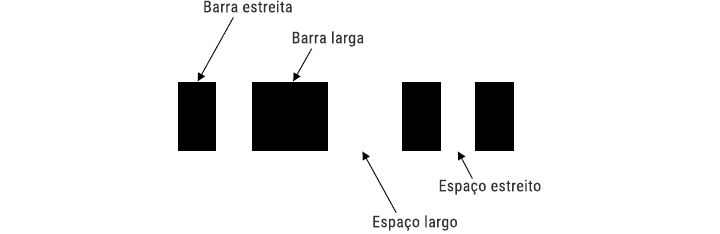 Um código de barras é uma combinação de barras e espaços estreitos e largos. Os nomes de cada barra e espaço estão listados e explicados a seguir: