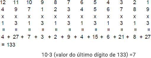 ③Totalize os valores multiplicados e então subtraia de 10 o valor do último dígito do valor total para obter o dígito de verificação.