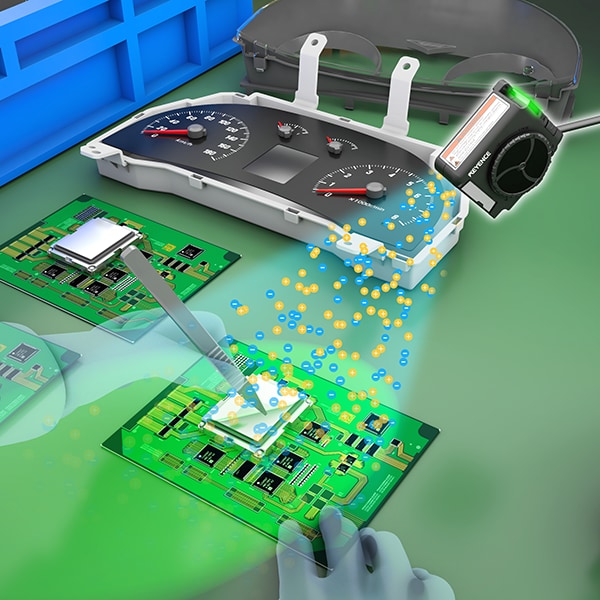 Durante o transporte, as PCBs ficam carregadas estaticamente devido ao contato e à separação das correias transportadoras. Cargas fortes podem levar à destruição por eletrostática e à adesão de partículas estranhas, o que por sua vez pode levar a defeitos de fabricação. Um ionizador pode reduzir esses defeitos eliminando a carga eletrostática.