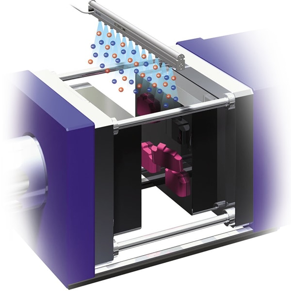 As peças moldadas geram eletricidade estática com muita facilidade, o que pode fazer com que grudem no molde até caírem em algum momento. Esse problema aumenta o custo em termos de tempo e dinheiro gastos na eliminação das peças com defeito e na remoção delas do molde. Um ionizador pode eliminar esse problema.