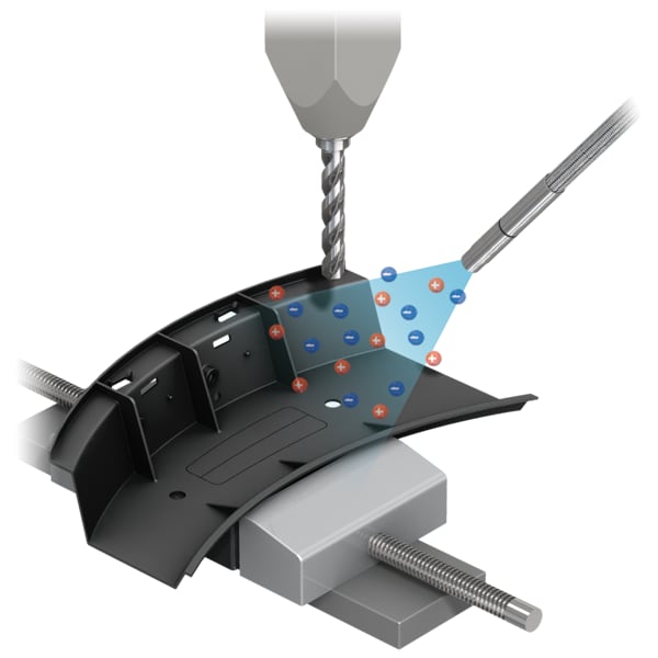 Quando uma peça de plástico, como um painel de instrumentos, é cortada, os resíduos desse processo permanecem presos à peça. Para evitar possíveis danos, esses resíduos devem ser eliminados – um ionizador com fornecimento de ar pode fazer exatamente isso.