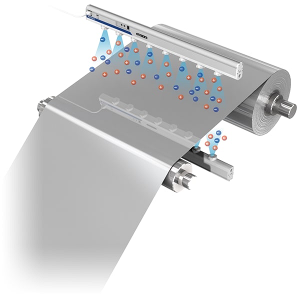 Para revestir o papel com uma camada de silicone, uma carga eletrostática muito forte (de 50 a 100 kV) é gerada no papel removível do adesivo, o que pode causar problemas como adesão de partículas estranhas, faíscas e desconforto do pessoal. Um ionizador pode eliminar esses problemas.